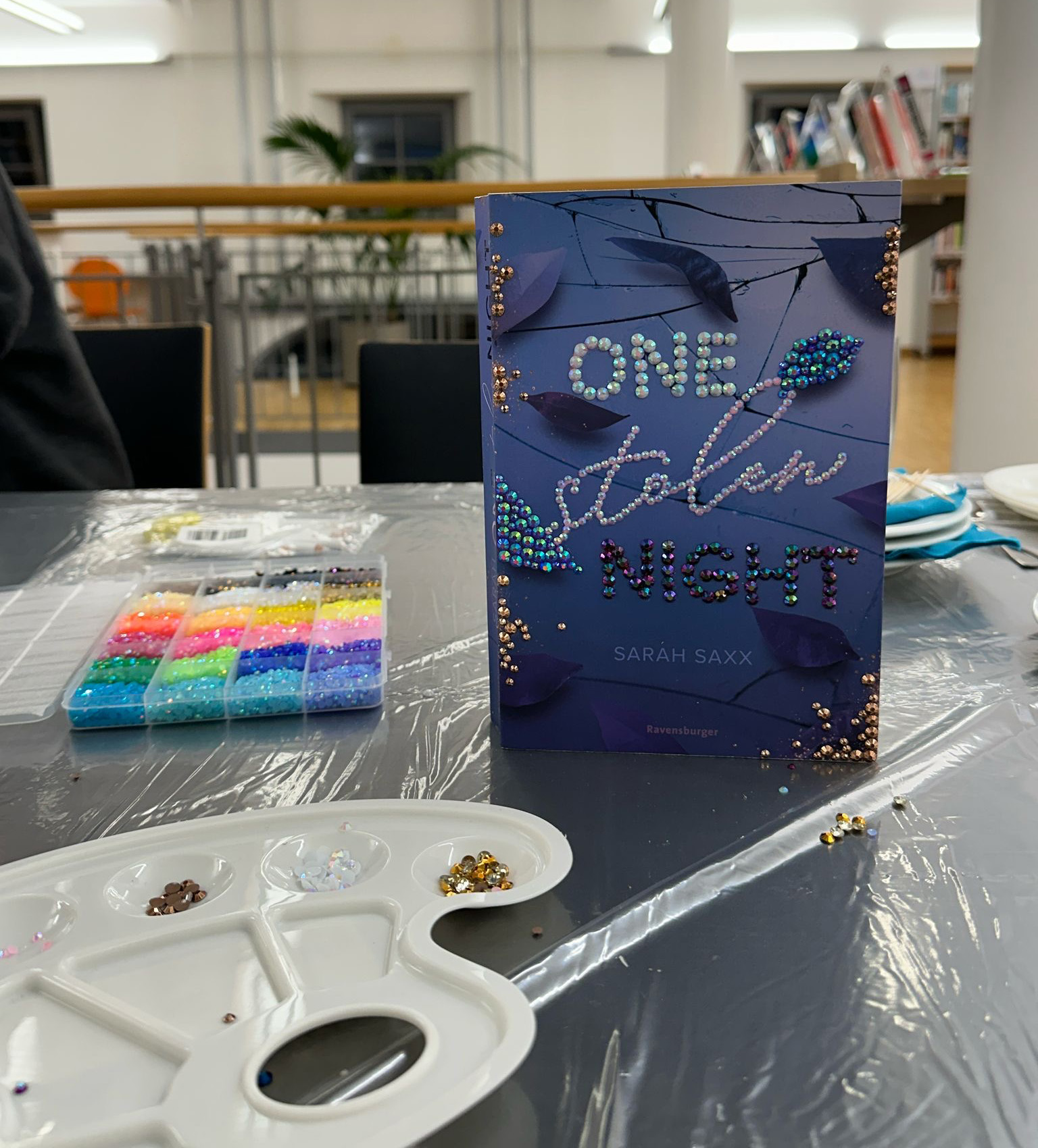 Anlässlich des Welttags des Buches wurde in geselliger Runde kreativ gearbeitet: Beim ‚Bookcover Bedazzling‘ verschönerten die Teilnehmenden ihre mitgebrachten Bücher mit funkelnden Strasssteinchen in verschiedenen Farben. Mit viel Freude und großem Engagement entstanden individuelle Kunstwerke.